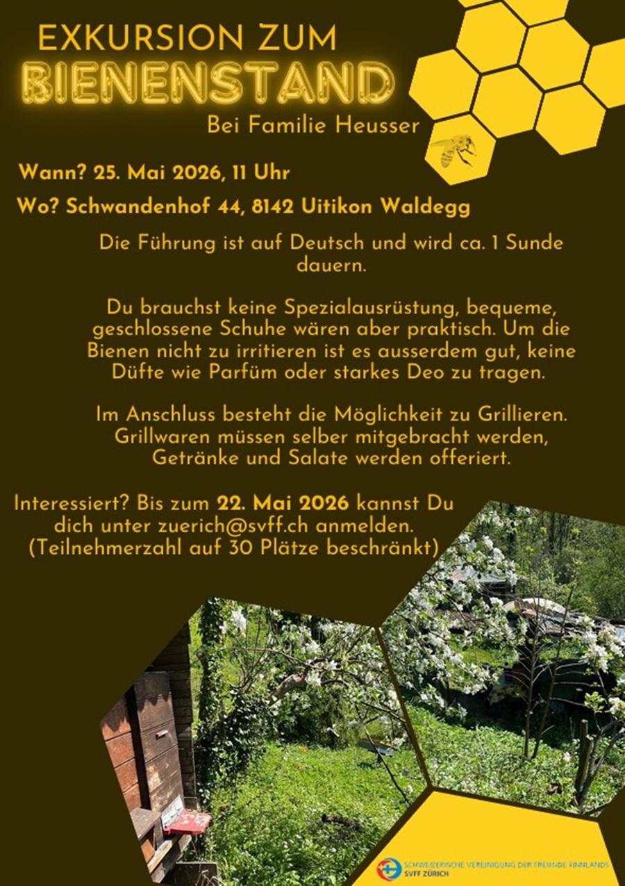 25. Mai 2026, 11:00 – 12:00 UhrSchwandenhof 44, 8142 Uitikon WaldeggSVFF Zürich Exkursion zum Bienenstand am 25. Mai. Genauere Informationen kannst du dem Flyer entnehmen. Flyer zum Runterladen Flyer - exkursion zum bienenstand