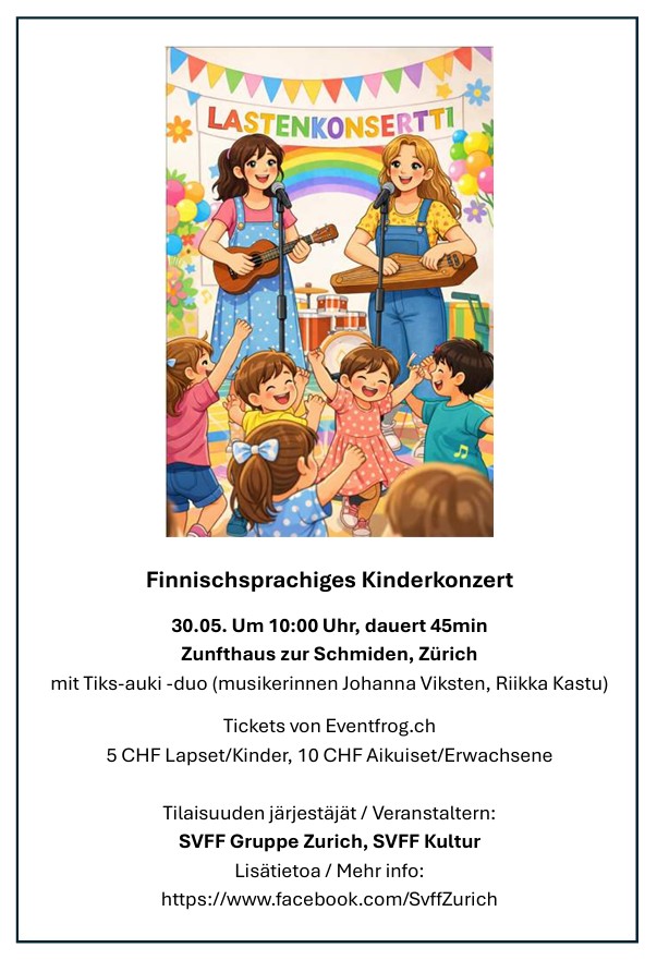 Lastenkonsertti suomenkielellä Zürichissä! Suomalaiset muusikot Johanna Viksten ja Riikka Kastu eli Tiks auki -duo, laulavat hilpeitä suomenkielisiä lauluja, joissa vahvistetaan ja opitaan suomea. Kertosäkeisiin ja liikkumaan pääsee halutessaan mukaan. Osallistavassa konsertissa soivat ukulelet, kantele sekä perkussiot.. Konsertin järjestää SVFF Zurich ja SVFF Kulttuuri. (huom! Paikkojen rajallisuus huomioiden max yksi aikuinen per lapsi. Jätetään paikkoja mieluummin lapsille).